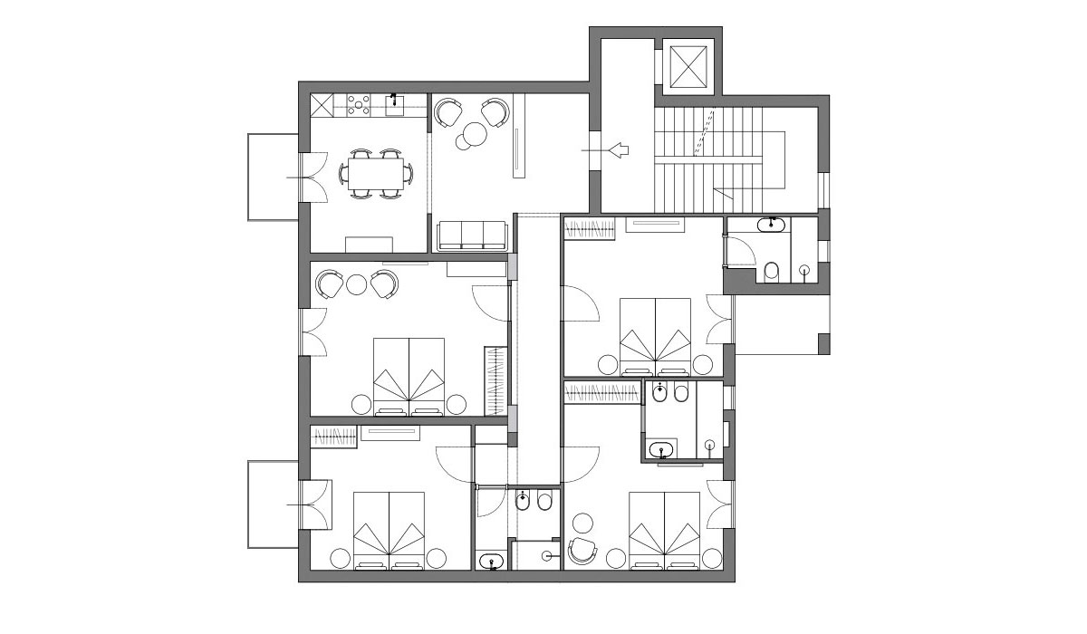 Recently renovated, the apartment offers four refined bedrooms, three full bathrooms, dedicated workspaces, and a spacious open-plan living area with a fully equipped kitchen, ideal for families, groups of friends, or extended stays of up to eight guests.