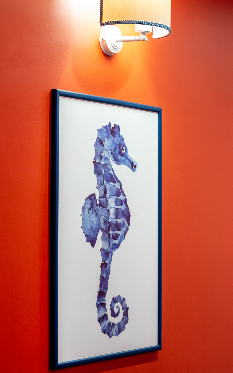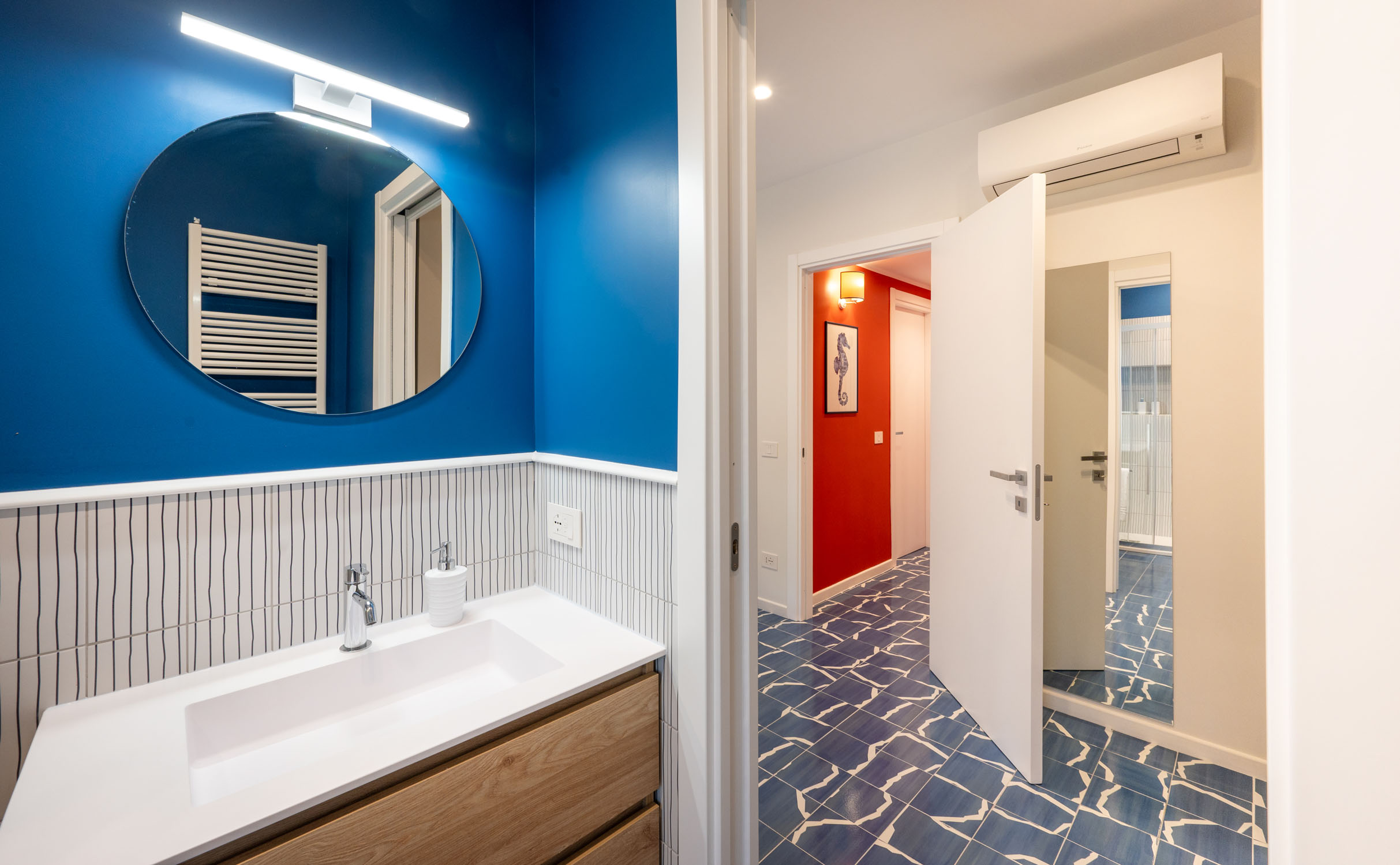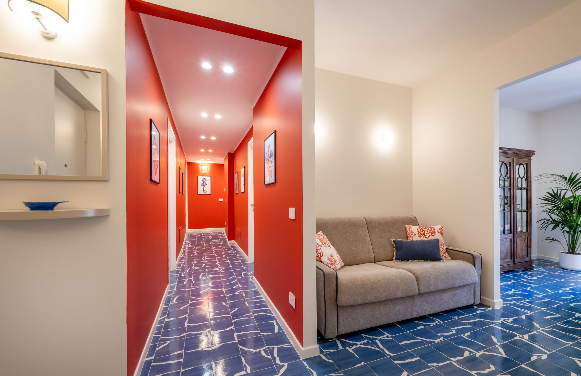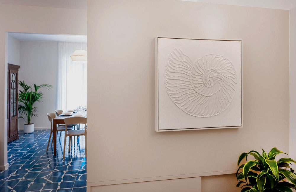 Inspired by the sea, the home reveals a strong visual identity. The vibrant coral-colored corridor, which gives The Coral House its name, is enhanced by marine-themed artworks depicting seaweed, fish, and a graceful seahorse. Blue-and-white patterned floor tiles run throughout the apartment, recalling the depth of the sea and the foam of the waves, creating continuity and character across every room.