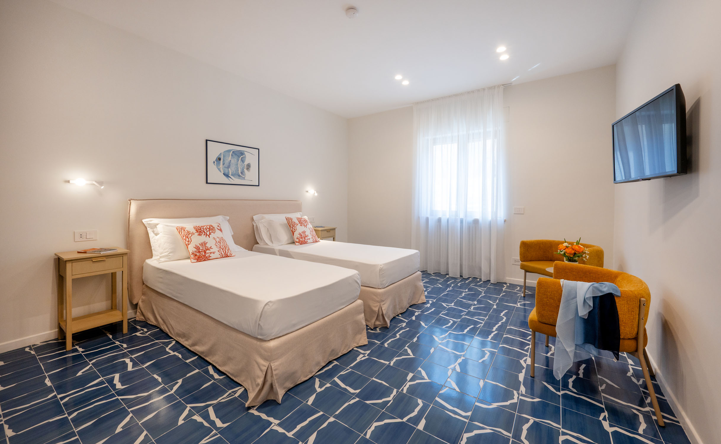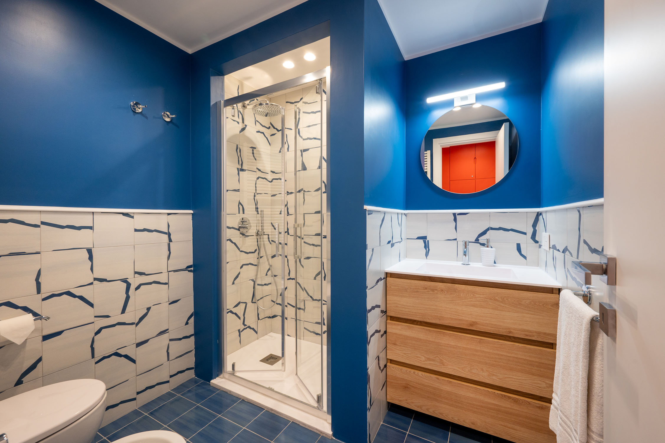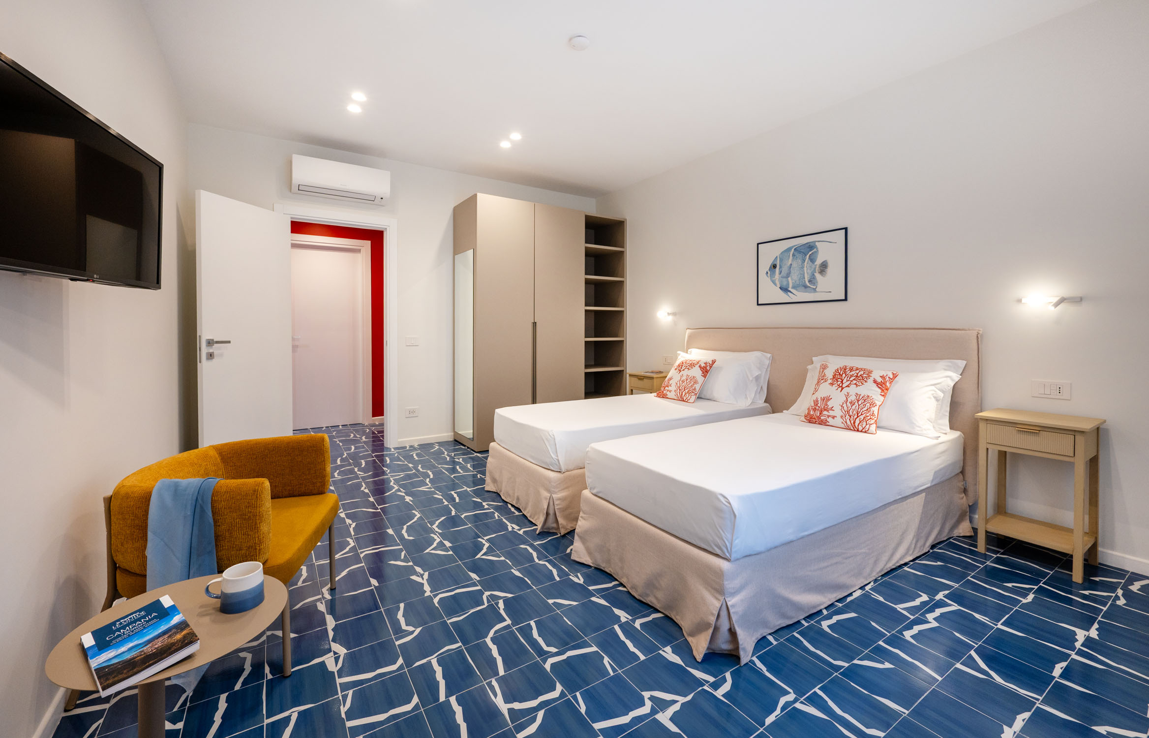 Inspired by the sea, the home reveals a strong visual identity. The vibrant coral-colored corridor, which gives The Coral House its name, is enhanced by marine-themed artworks depicting seaweed, fish, and a graceful seahorse. Blue-and-white patterned floor tiles run throughout the apartment, recalling the depth of the sea and the foam of the waves, creating continuity and character across every room.